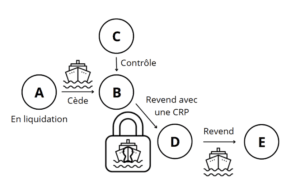 La société A est mise en liquidation judiciaire et ses actifs sont cédés à la société B, elle-même contrôlée par une société C. Les actifs comprennent notamment un navire en cours de construction financé par une société D qui s’engage à l’acquérir.